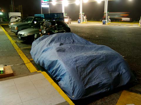 The drive south was again, beautiful, but our minds were more occupied on the very limited charge we had, the 2 damaged shock absorbers on the rear, and the ominous black clouds that accompanied the nightfall. In addition to this, the traffic heading for Mexico City was absolutely suicidal; huge 26 wheeled trucks were bearing down at us from all sides, overtaking in any space available even if that would mean breaking the speed limit or driving on the hard shoulder. But our driving skills, honed in the SRZero over the last month and a half, served us well and we navigated our way safely down the highway.